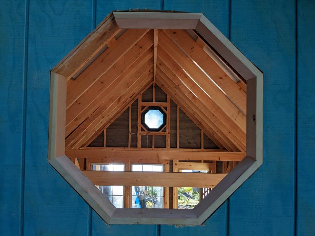 - Octagonal windows in the peak